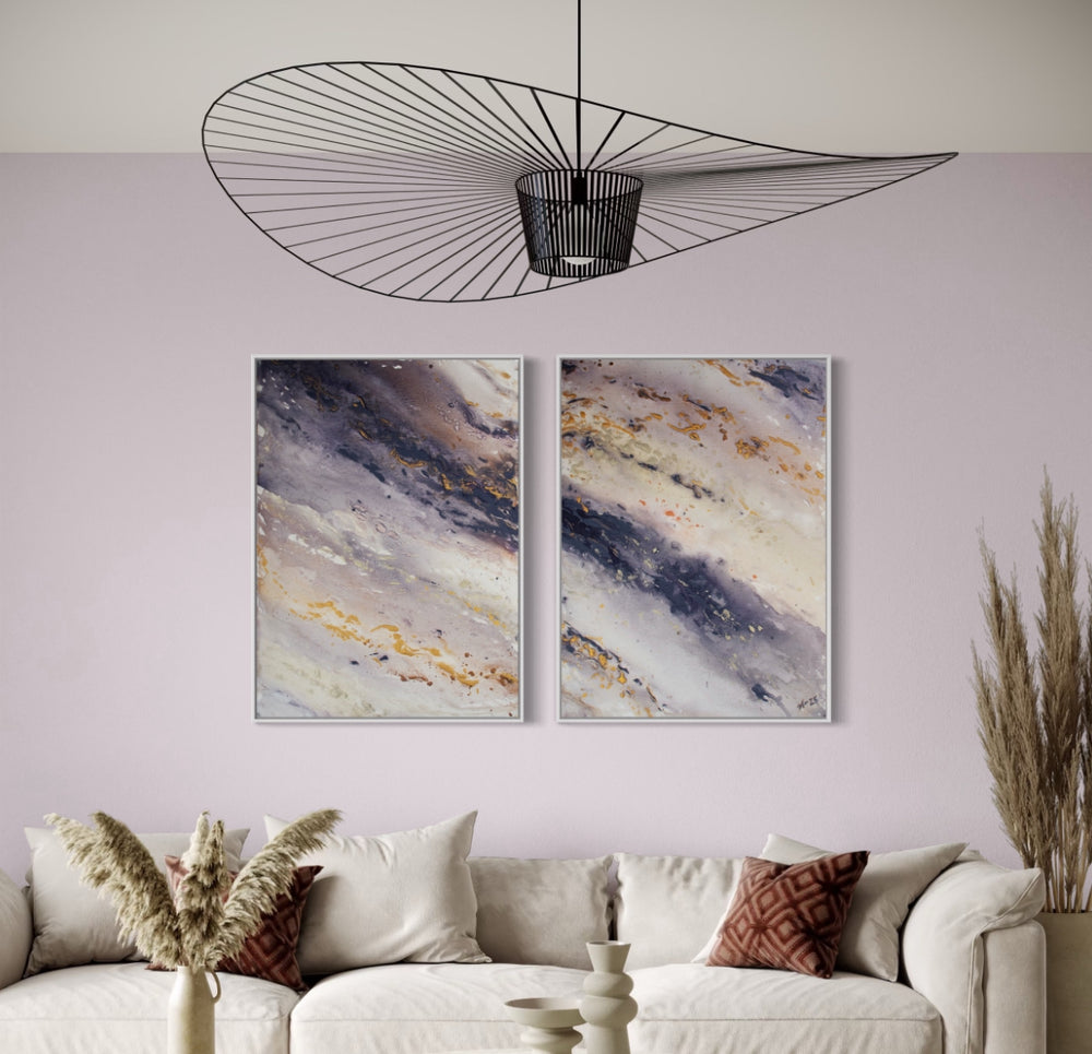 "Marble Wave" An abstract painting made in acrylic. A marble-like painting that exudes luxury. Two divided canvases where each canvas has the size 70 x 50 cm. (frames not included) Signed by the artist with a certificate of authenticity included. Original painting, handpainted with 2 cm edges. See the close up pictures on the beautiful structure and golden details.